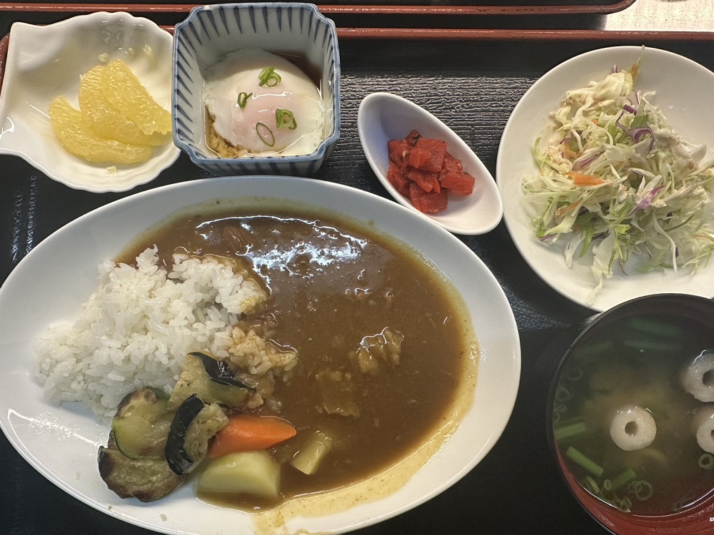 カレーライス・味噌汁・温泉卵・サラダ・福神漬け・はるか